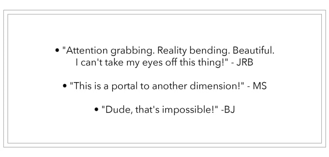 This isn't our first illusion. Our previous , "Slow Dance" , raised over $550,000 and now lives in over 9,000 homes around the world — a simple frame that made real objects move in slow motion.